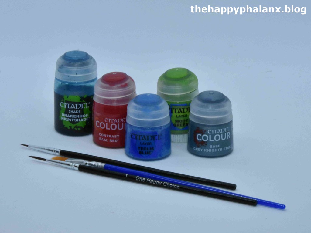 I use Citadel paints, not out of any great loyalty to Games Workshop, but simply because I have been using them for over 20 years now and I feel comfortable using them. I would suggest asking people at your friendly local games store (often abbreviated to FLGS), what they recommend or try using a friend’s paints for a mini or two to get a few for how the paint works for you. Although the paints can be surprisingly expensive for their small size, most of them will last a long time with a little care, i.e. adding a drop or two of water every so often and giving them a good shake.