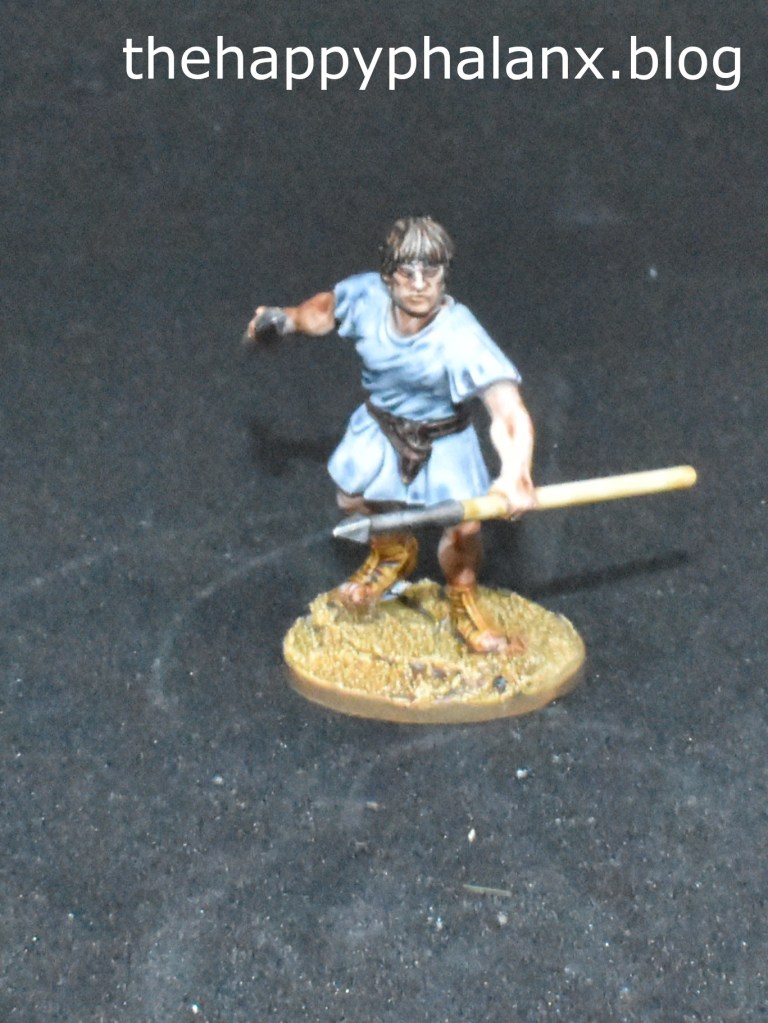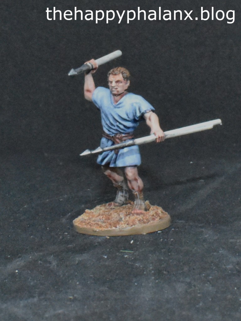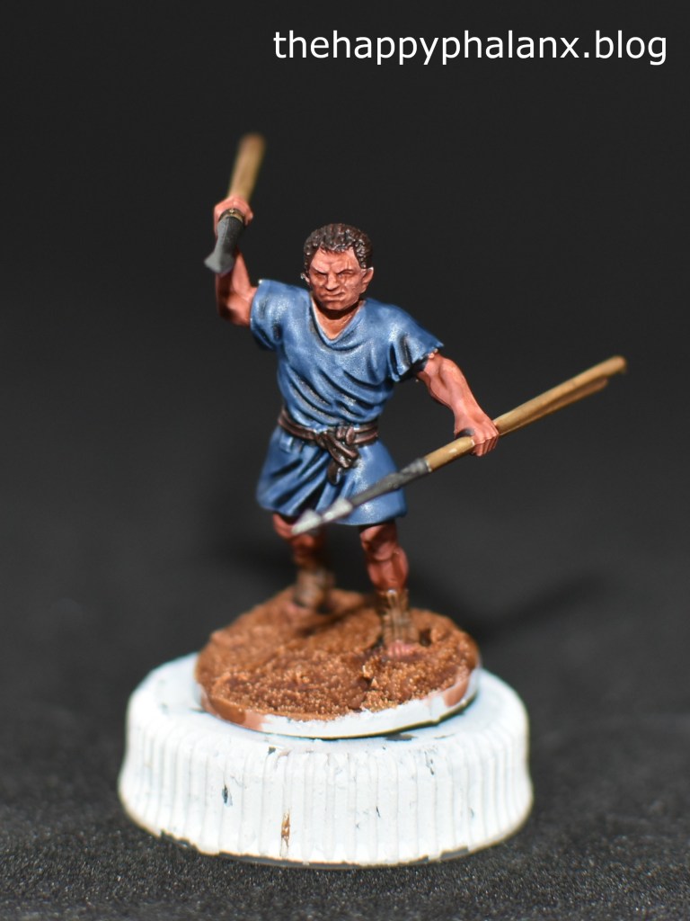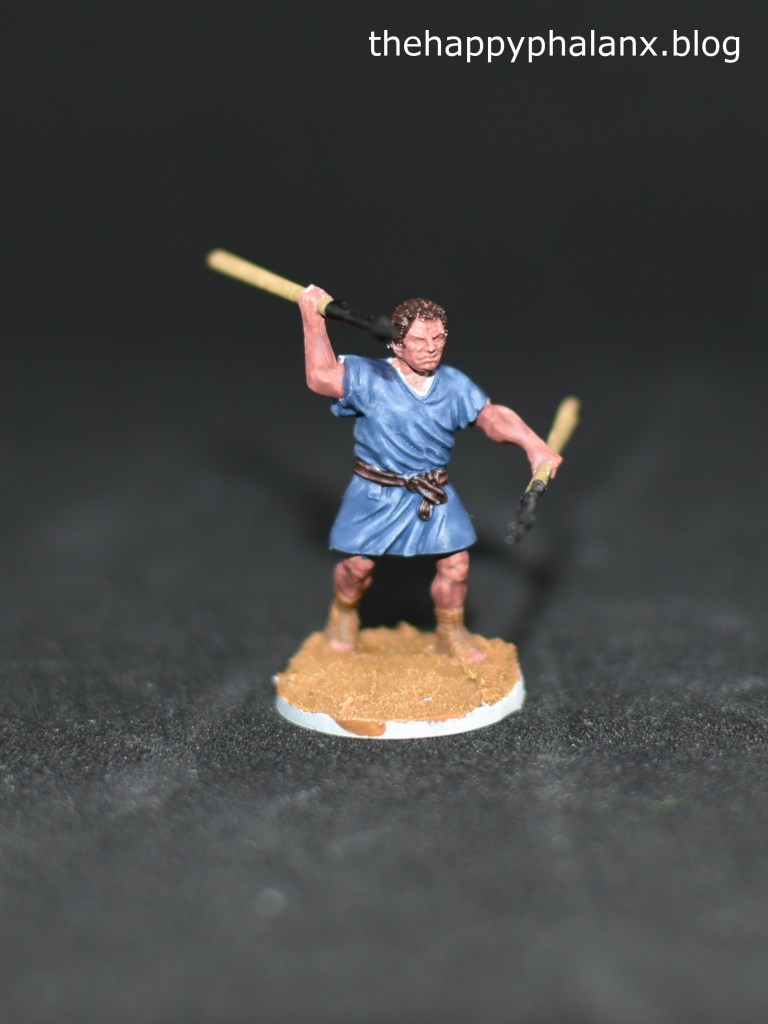Here is one of the two velites from above, after I painted the base colours on him. If using citadel paints, they actually label certain colours a “bases”, making it easier to know what colour to start with.